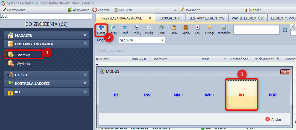 - W module DOSTAWY I WYDANIA / Dostawy, po wybraniu magazynu, kliknij ikonę Dodaj i wybierz jako typ dokumentu BO.