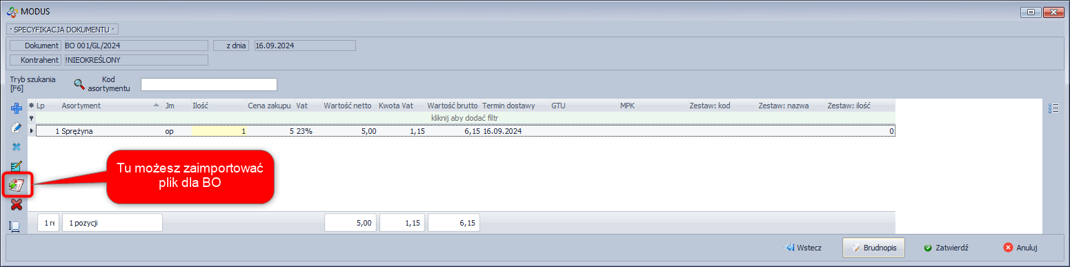 - Zapisz i zatwierdź dokument - ta opcja zatwierdzi automatycznie dokument, nie będzie już możliwości wprowadzenia zmian w specyfikacji dokumentu BO.