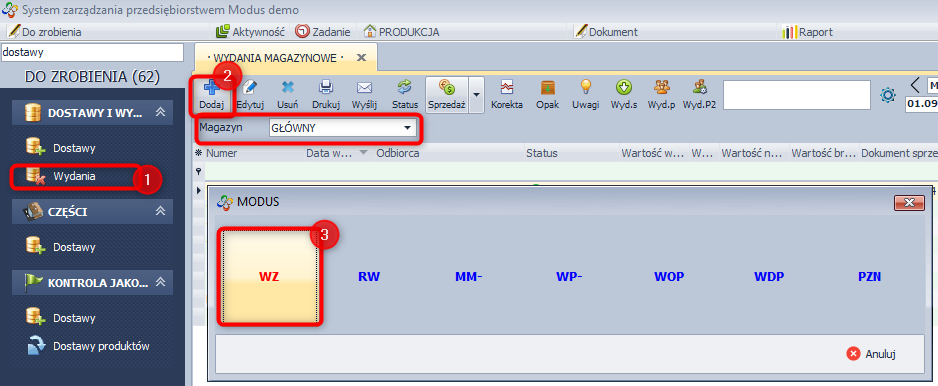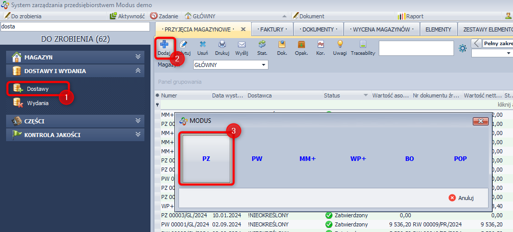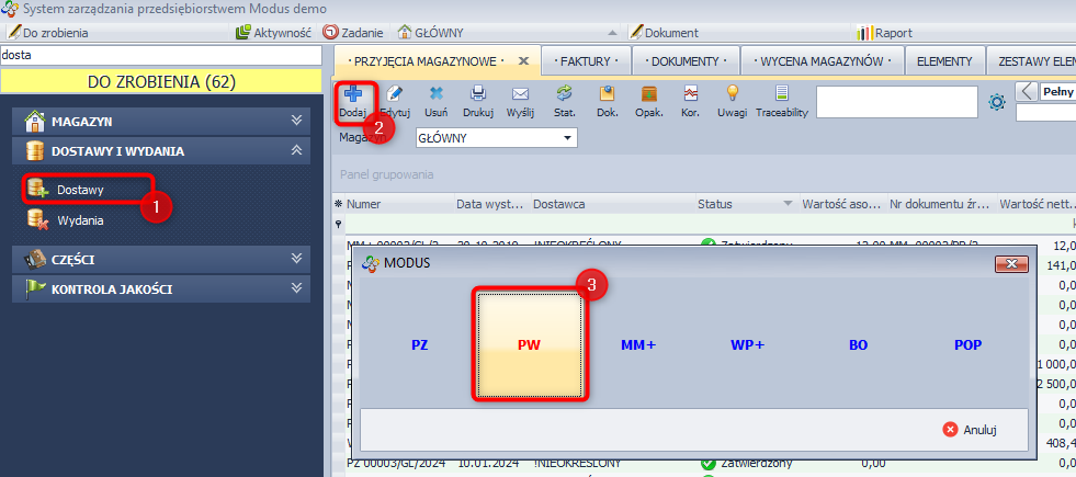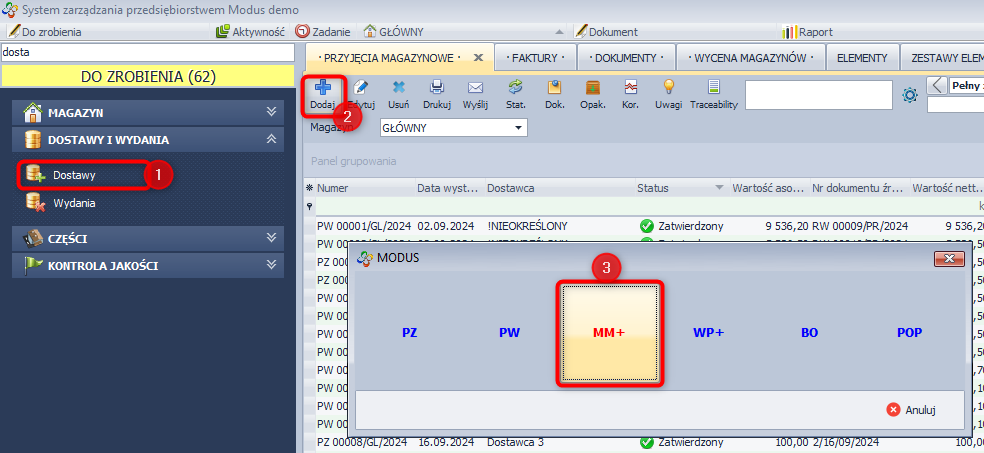 - W module DOSTAWY I WYDANIA / Dostawy (1) kliknij ikonę Dodaj [+] (2) i wybierz typ dokumentu MM+ (3).