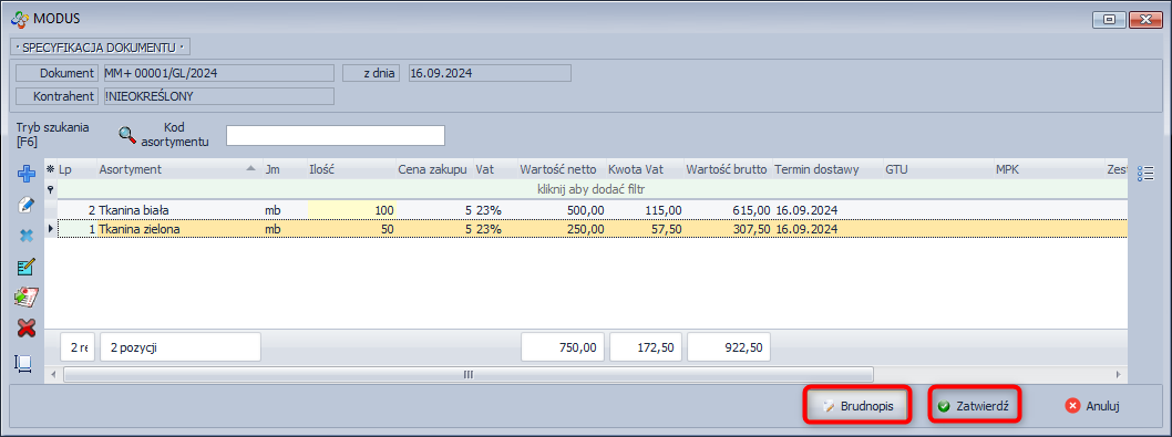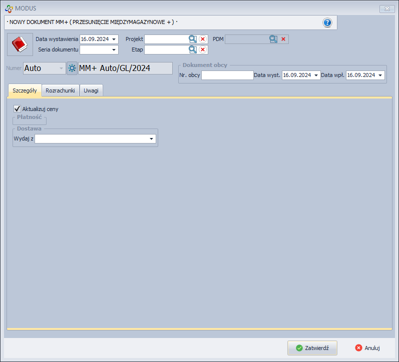 - Zapisz i zatwierdź dokument - ta opcja zatwierdzi automatycznie dokument, nie będzie już możliwości wprowadzenia zmian w specyfikacji dokumentu MM-.
