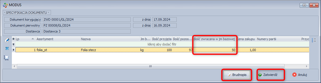 Za pomocą ikony Usuń, możesz usunąć te pozycje których zwrot nie dotyczy. - Domyślną ilością zwracaną jest ilość pozostała na magazynie pochodząca z danego przyjęcia. Aby ustalić jaka ilość towaru ma zostać zwrócona zaznacz odpowiedni rekord i kliknij ikonę Dokonaj korekty.