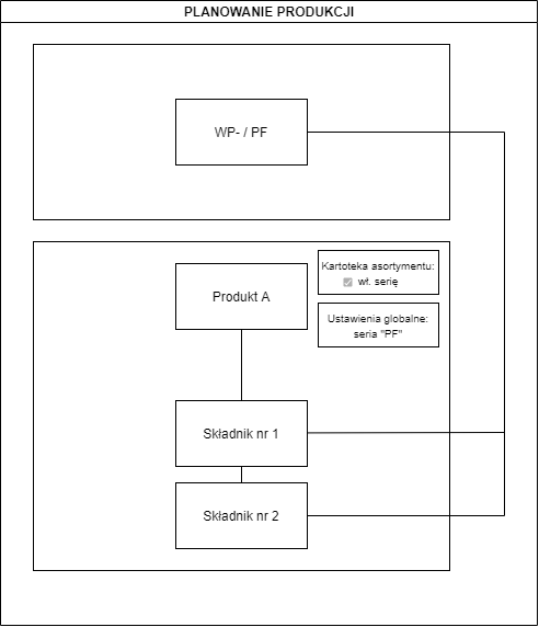 - W ustawieniach globalnych określamy serię dokumentu WP- (Produkcja/Planowanie → oddzielny dok. WP- dla każdego produktu, seria WP-),