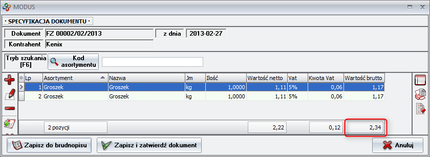 W specyfikacji generowanego dokumentu dla każdej poszczególnej pozycji, określana jest wartość podatku VAT i wartość brutto, a następnie w podsumowaniu widoczna jest suma wszystkich wartości.