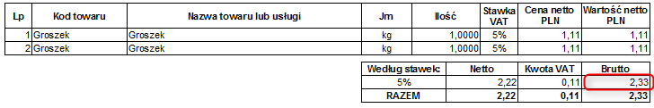 Na dokumencie natomiast, zgodnie z przepisami znajduje się tabela stawek VAT. Dla każdej stawki obliczana jest suma wartości netto asortymentów objętych daną stawką VAT. Następnie dla każdej z tych sum, zgodnie z poszczególnymi stawkami, wyznaczana jest wartość VAT i wartość brutto.