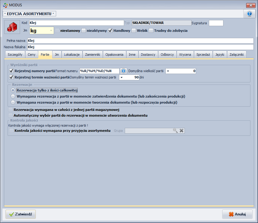 - Numer partii, który jest ciągiem znaków o maksymalnej długości 50 znaków; numer partii może pochodzić zarówno od producenta/dostawcy asortymentu, jak i być nadany przez użytkownika w systemie Modus.