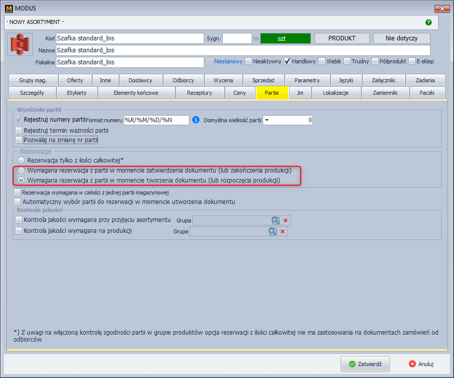 Wydanie czytnikiem odbywa się za pomocą rezerwacji konkretnej partii wyprodukowanego produktu, a więc warunkiem koniecznym do wydania produktu jest włączenie opcji Wymagana rezerwacja z partii