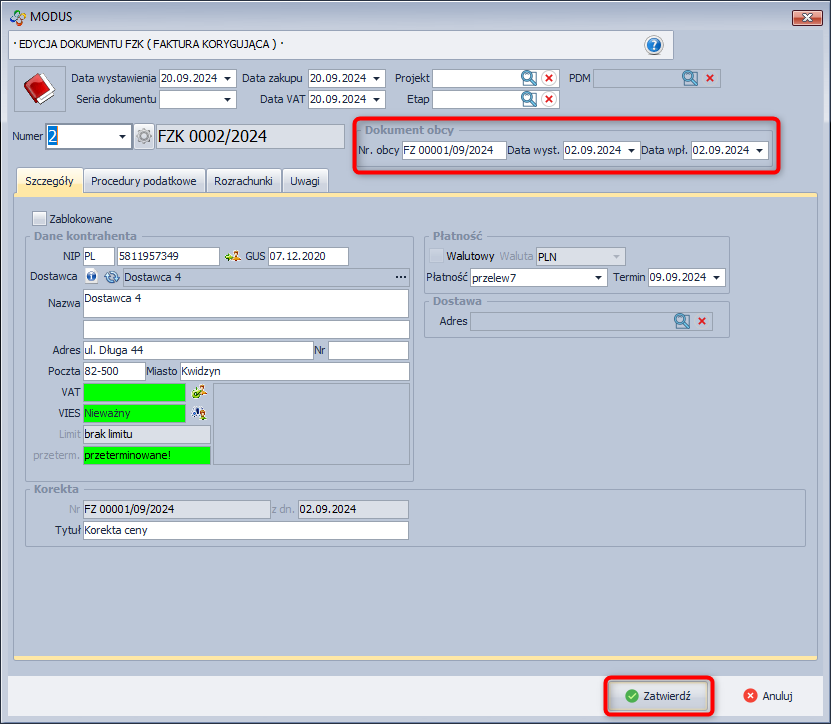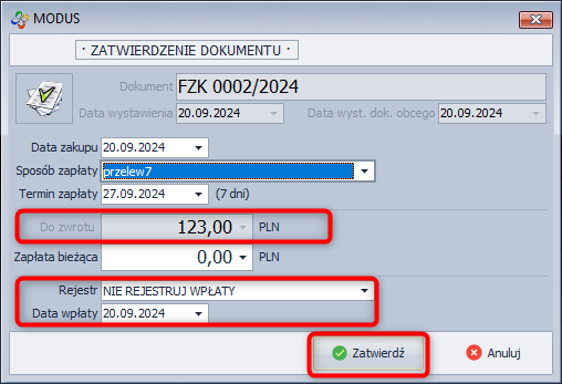 Zatwierdzenie dokumentu FZ