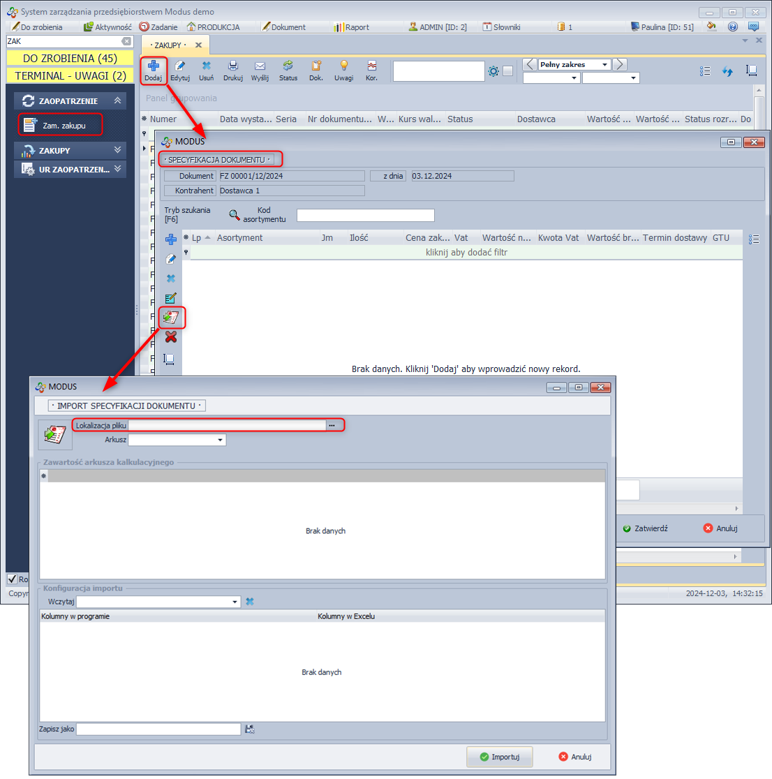 W systemie Modus istnieje możliwość zaimportowania specyfikacji dokumentu FZ z pliku xls.