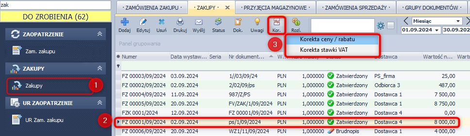 - Przejdź do modułu ZAKUPY i wybierz Zakupy.