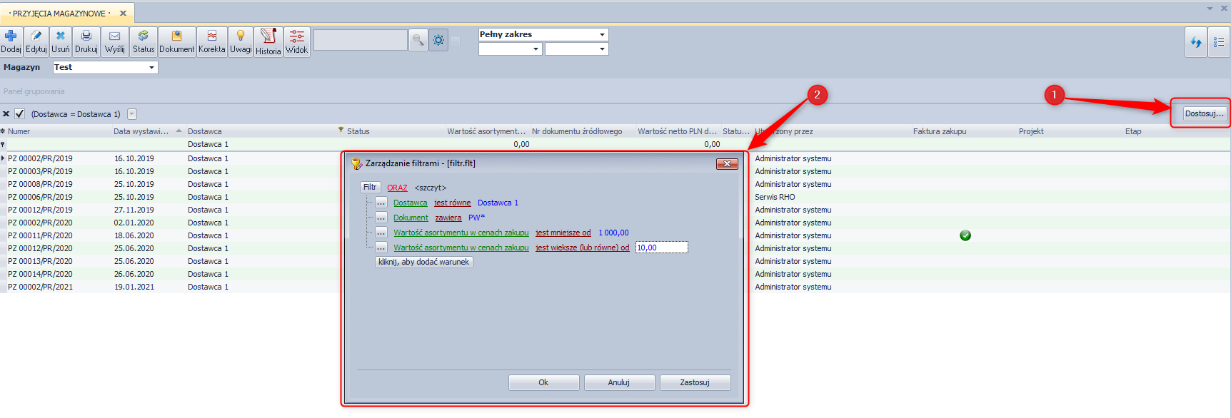 Po włączeniu jakiegokolwiek filtra z prawej strony ekranu pojawia się ikona Dostosuj…, która umożliwia zdefiniowanie własnego kryterium filtrowania. Po jej kliknięciu wyświetlone zostanie drzewo z poziomu którego możemy edytować lub dodawać nowe kryteria filtrowania. Modyfikacja kryteriów odbywa się przez kliknięcie w podkreślone słowo i wybranie pozycji z wyświetlonej listy.