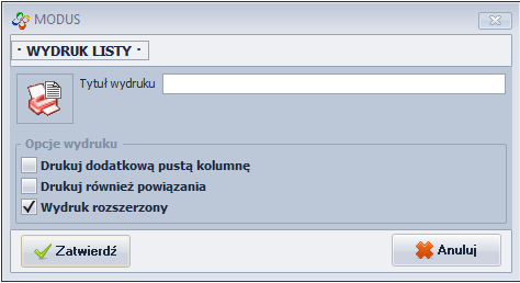 Natomiast w przypadku drukowania listy istnieje możliwość nadania tytułu, lub zawarcia w wydruku informacji powiązanych z danymi głównymi. Gdy użytkownik zamierza wydrukować listę, program wyświetla okno, które pozwala wprowadzić odpowiednie wartości. Drukując listę z poziomu panelu szczegółów (czyli zawierającą tylko informacje powiązane z danymi z głównej listy) osoba obsługująca program ma tylko możliwość nadawania tytułu wydrukowi.