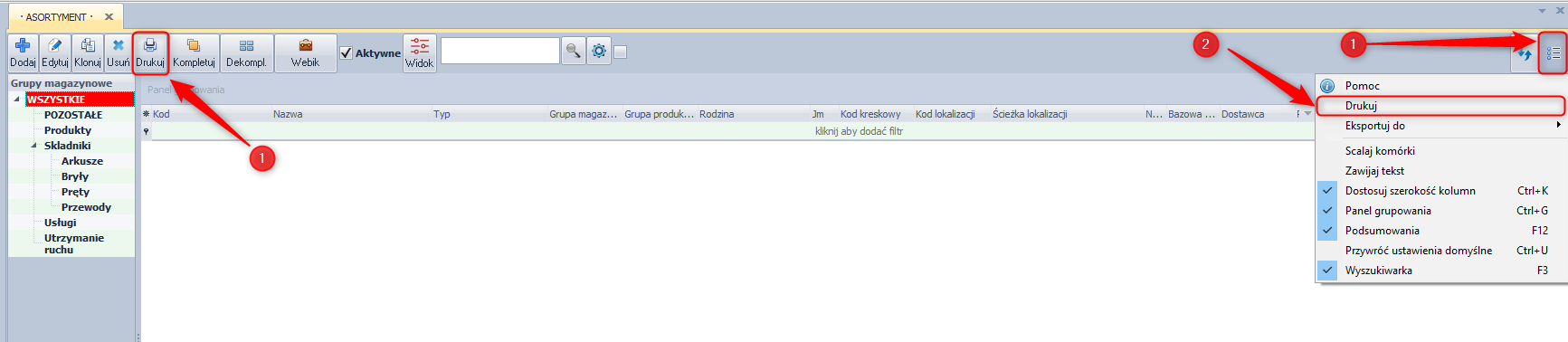 W programie istnieją dwa powszechne narzędzia pozwalające użytkownikowi drukować dokumenty: Drukuj dokument oraz Drukuj Listę. Istnieją jeszcze dwa dodatkowe, które zostaną opisane w operacjach niestandardowych, gdyż właściwe są tylko pojedynczym modułom. Obsługa operacji drukowania dokumentu oraz listy przez użytkownika przebiega niemalże identycznie. Z jednym wyjątkiem, gdy użytkownik zamierza wydrukować dokument, po wybraniu pozycji z listy oraz naciśnięciu ikony Drukuj program przechodzi automatycznie do podglądu wydruku. Program także automatycznie nadaje tytuł wydrukowi na podstawie wybranego typu dokumentu.