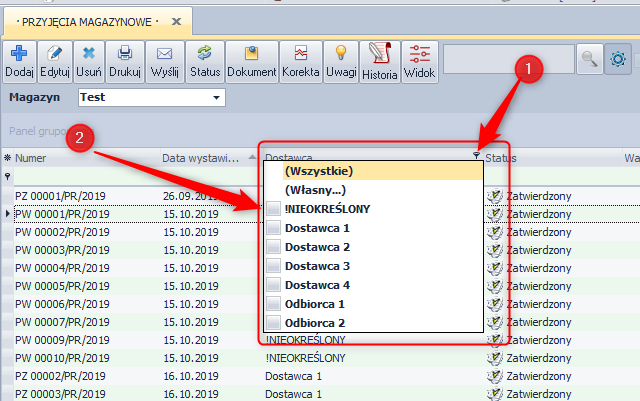 W programie jest możliwość filtrowania danych dla każdej kolumny. Po najechaniu myszką na tytuł kolumny pojawia się z prawej strony przycisk listy rozwijanej, na której wyświetlane są wartości występujące w danej kolumnie.