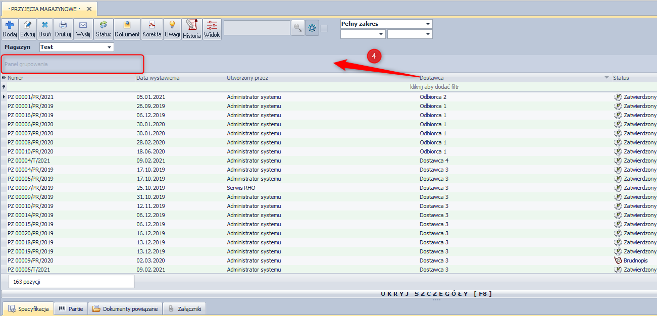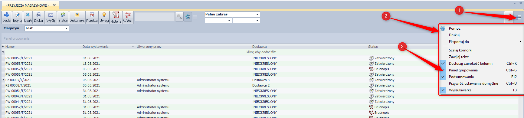 Przy wybraniu tej opcji powyżej obszaru tytułów kolumn pojawi się nowy obszar → Panel grupowania, który można włączyć także za pomocą skrótu Ctrl+G. Przeciągając w ten obszar tytuły kolumn dokonuje się grupowania po zawartości tych kolumn. Możliwe jest grupowanie zagnieżdżone np. po kontrahencie, a następnie po dacie wystawienia dokumentu.