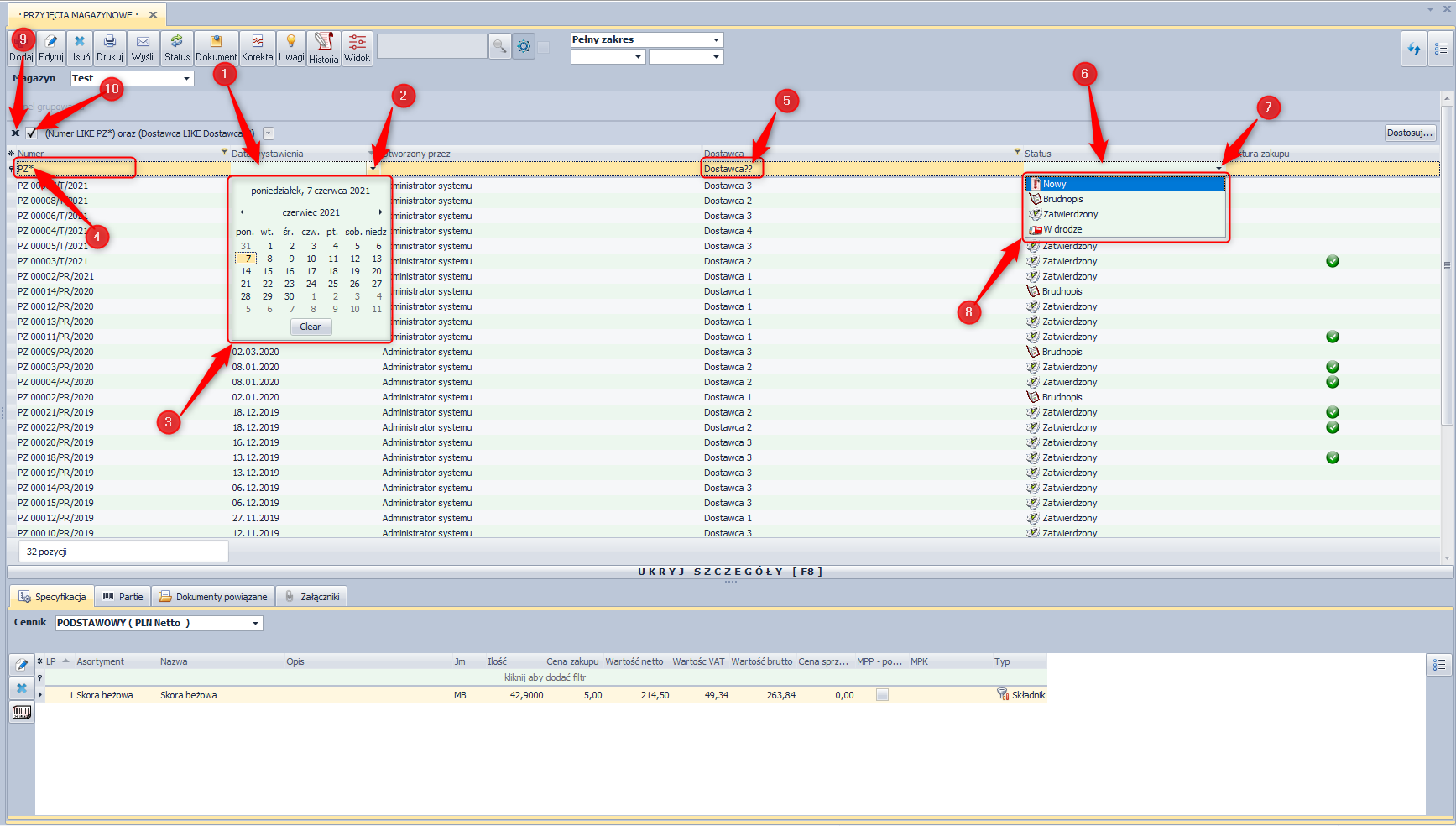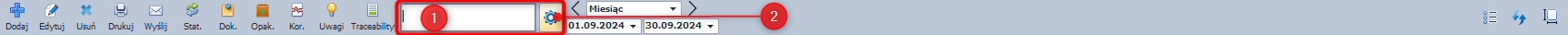 W niektórych kolumnach np. Status lub wszystkie kolumny zawierające datę po kliknięciu w pole wyszukiwania dostępne jest rozwijane menu w którym wybrać można, w przypadku Statusu odpowiednie, dopuszczalne dane (nowy, zatwierdzony, brudnopis). W przypadku pól z datą po rozwinięciu menu pojawi się kalendarz w którym ustawić można datę.
