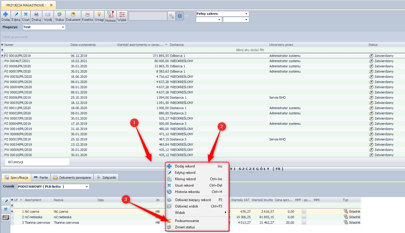 - status Zatwierdzony - status ten informuje innych użytkowników systemu, że ten dokument został wystawiony poprawnie. Treści takiego dokumentu nie można edytować do momentu zmiany jego statusu na Brudnopis. W niektórych modułach zapisanie dokumentu ze statusem zatwierdzony powoduje pojawienie się rekordów w innych modułach np. Zatwierdzone zamówienie sprzedaży powoduje pojawienie się pozycji w Planowaniu produkcji.