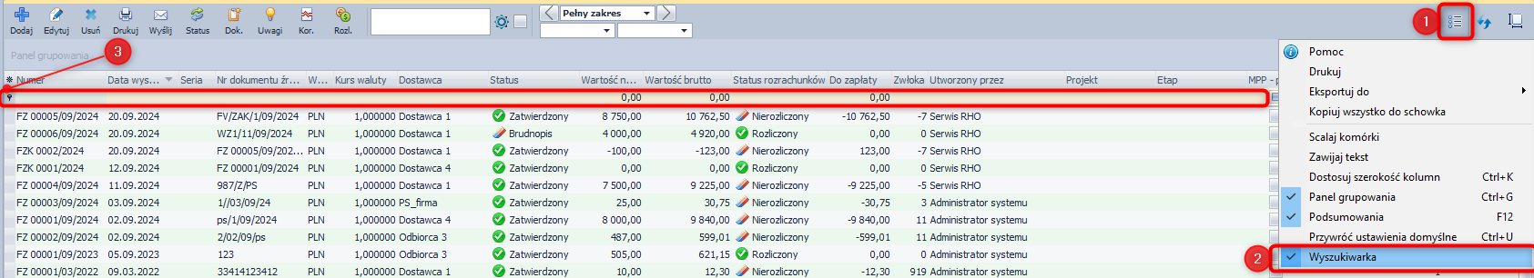 Wszystkie opcje (wyszukiwarka, grupowanie, podsumowanie) można ze sobą łączyć.