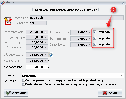 - W oknie Generowanie zamówienia do dostawcy wybierz parametry wpływające na ilosć zamawianą.