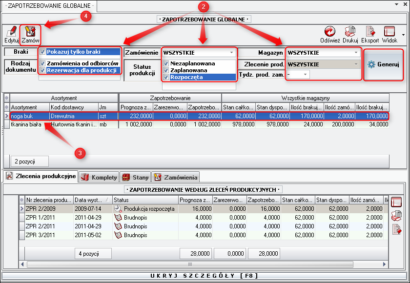 - dokumenty generujące zapotrzebowanie (wszystkie lub wybrane)