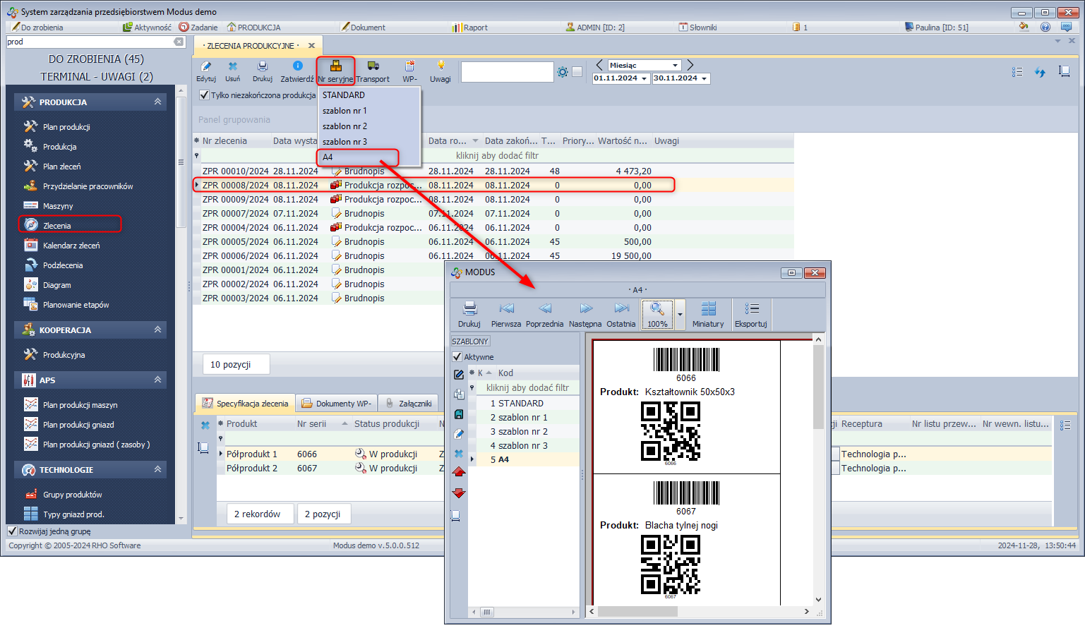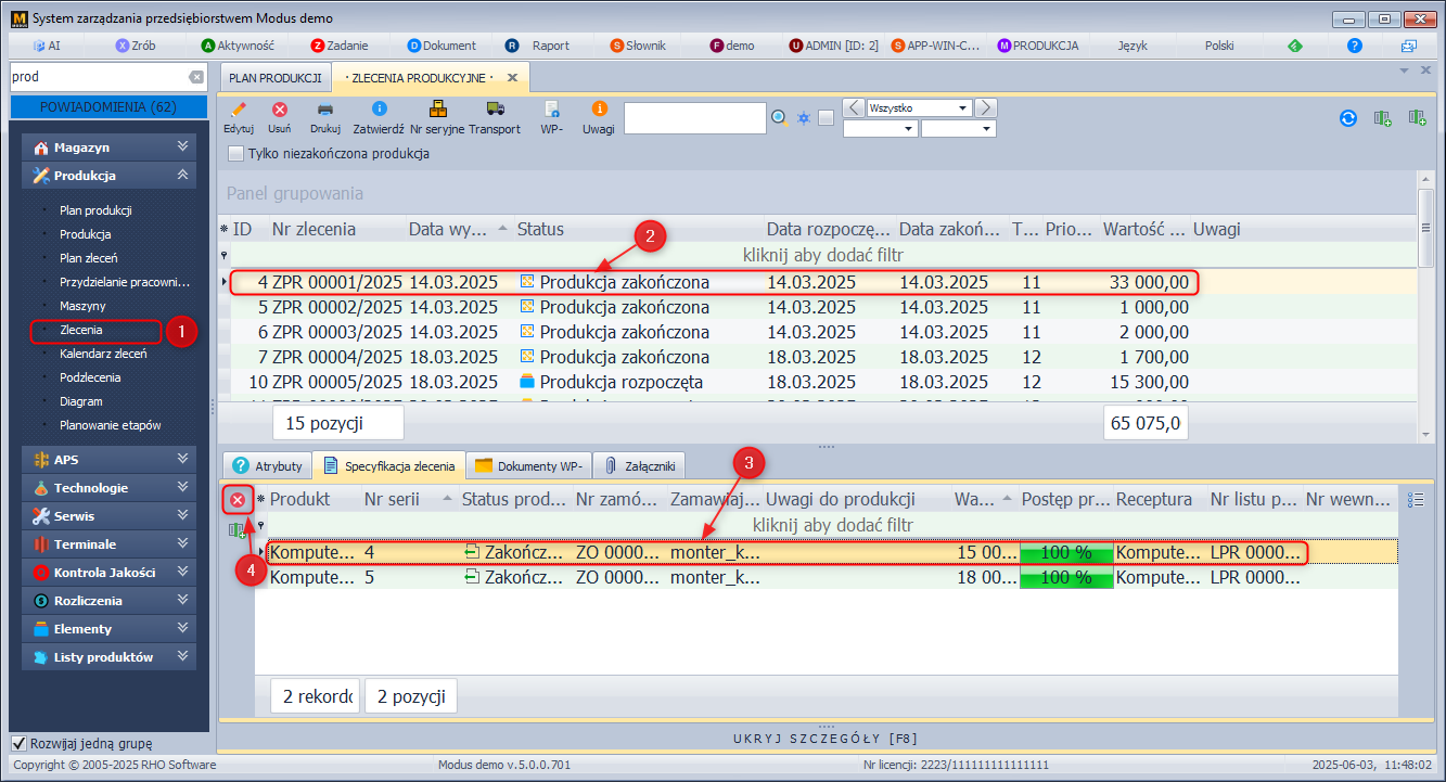 Odnotowanie zakończenia poszczególnych etapów produkcji może odbyć się zarówno za pośrednictwem terminala produkcyjnego wyposażonego w czytnik kodów kreskowych, jak i z poziomu systemu Modus (moduł Produkcja podmoduł „Planowanie”).