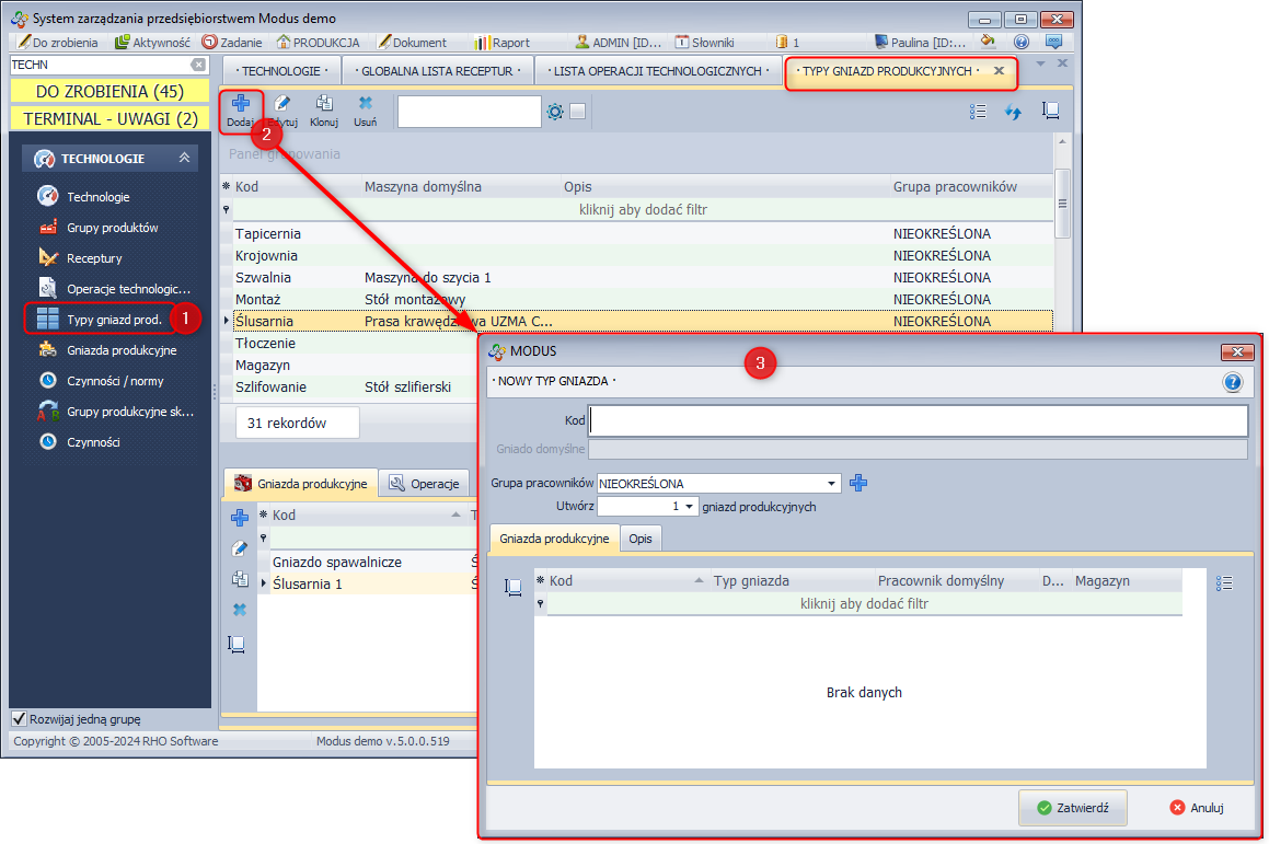 - W module Technologie wybierz Gniazda produkcyjne.
