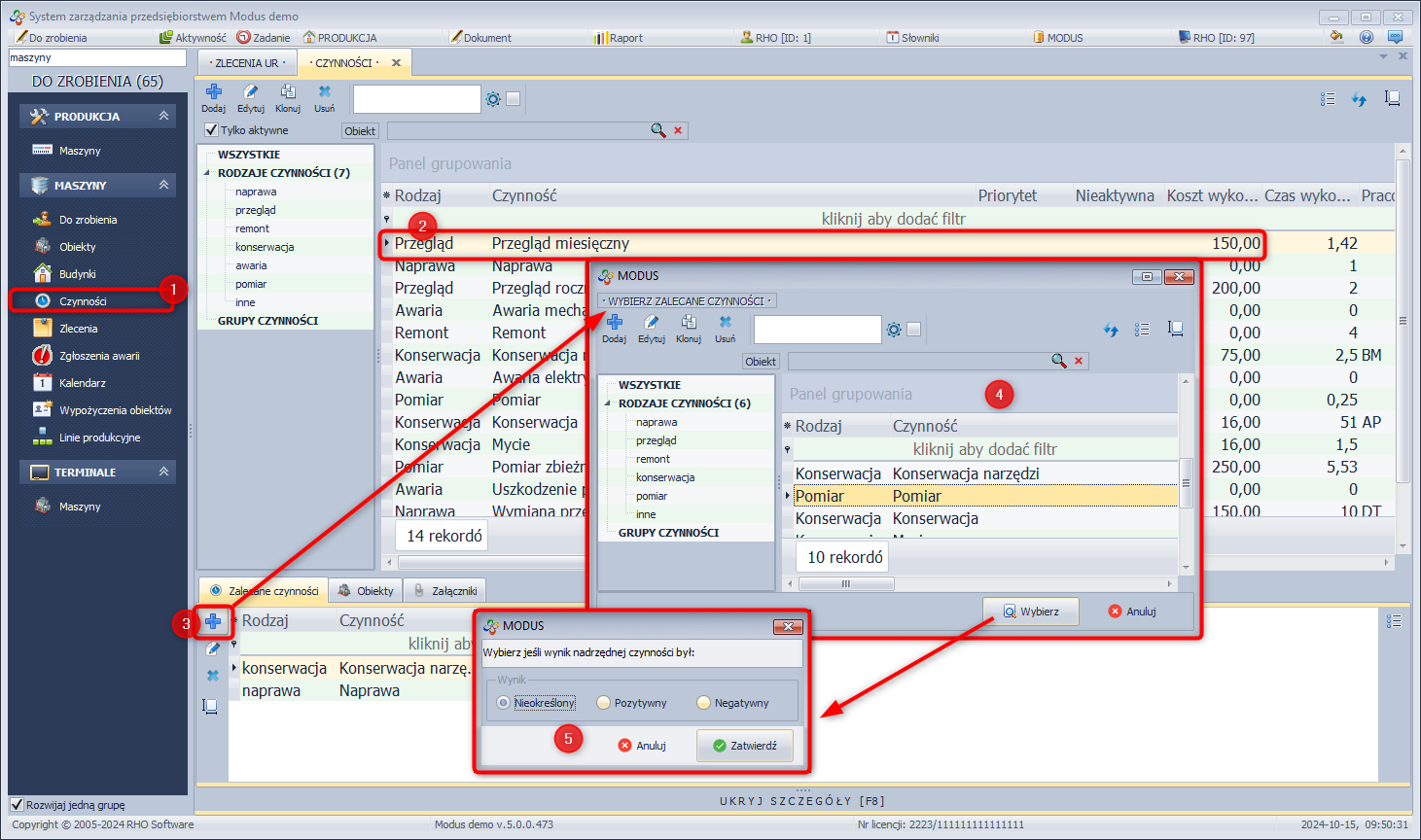 - Dla pozostałych typów czynności (przegląd, remont, konserwacja, naprawa) możemy określić czynność którą należy wykonać jeśli czynność nadrzędna zakończyła się z określonym wynikiem. Np. dla danego przeglądu możemy dodać kilka czynności zalecanych wraz z określeniem przypadku w którym powinny zostać wykonane: