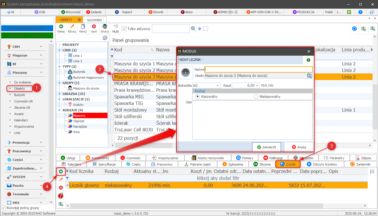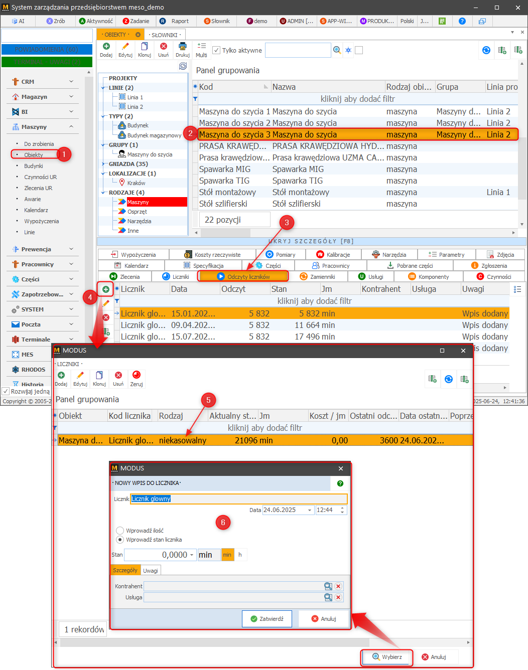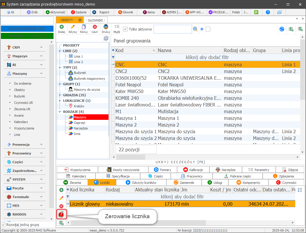 Lista służy do ewidencji liczników znajdujących się w maszynach oraz odnotowywania ich odczytów. Każde urządzenie ma licznik główny powiązany z licznikiem linii produkcyjnej. Stan licznika głównego jest automatycznie uzupełniany po dokonaniu odczytu dla licznika linii produkcyjnej. Odczyty z liczników mogą być podstawą rozliczeń z wykonywanych usług. Informacje jak zafakturować usługę w oparciu o wskazania licznika znajdziesz tutaj.