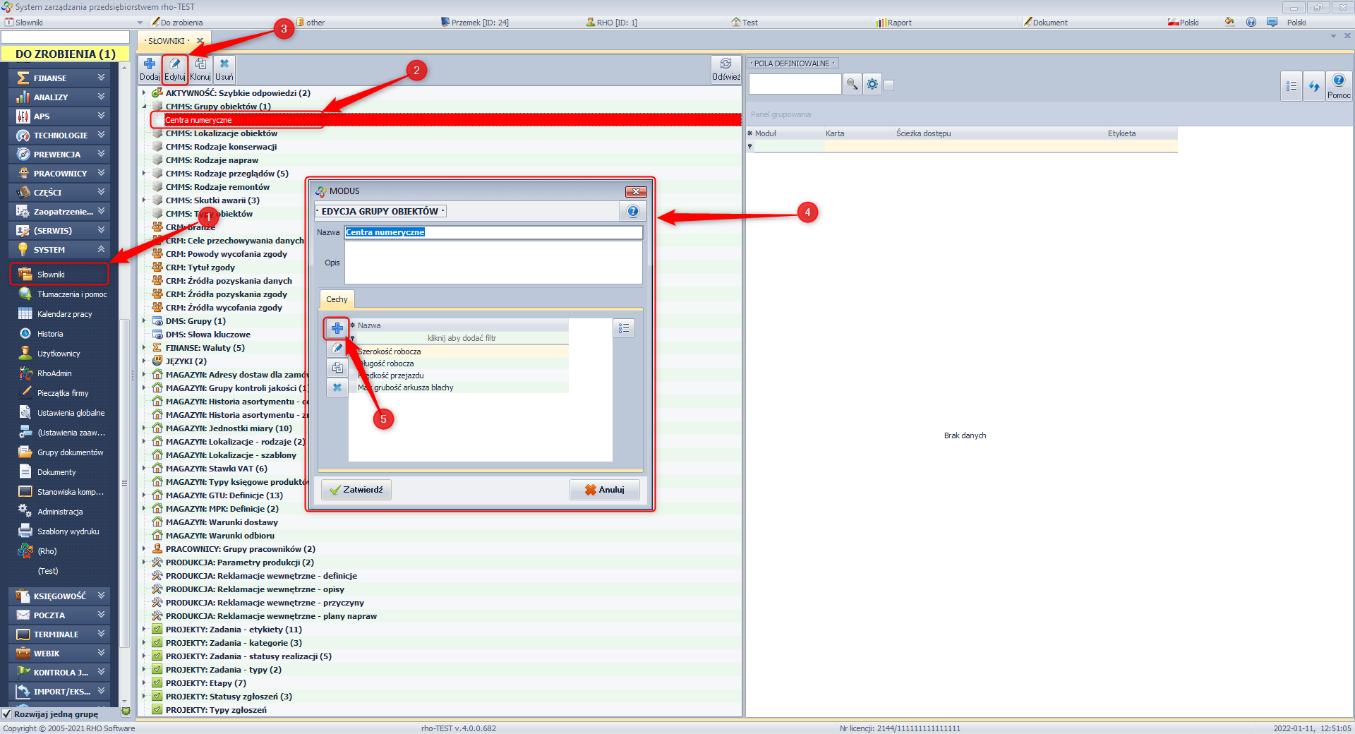 - Wybierz cechę, której wartość chcesz określić - jeśli lista cech jest pusta musisz je zdefiniować (System/Słowniki/Grupy obiektów/Edycja/Dodaj cechę)
