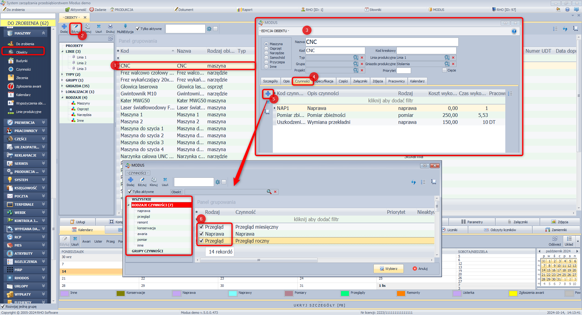Podmoduł służy do ewidencji obiektów oraz informacji z nimi związanych. Przedstawia listę zdefiniowanych maszyn, narzędzi, osprzętu, budynków. Dla każdego obiektu możliwe jest zdefiniowanie listy czynności serwisowych związanych z jego obsługą.