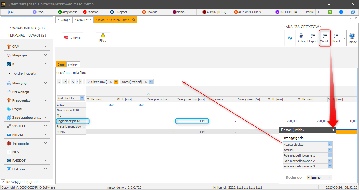 - Czas przestoju - łączny czas przestojów ze zleceń naprawy (czas wprowadzane na kartę Wykonaj zlecenie)