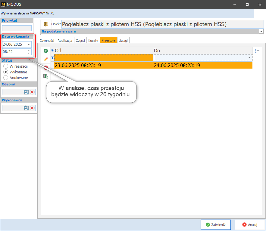 W analizie widoczne są dane dotyczące czasu przestoju, których Data wykonania zlecenia serwisowego mieści się w analizowanym okresie.