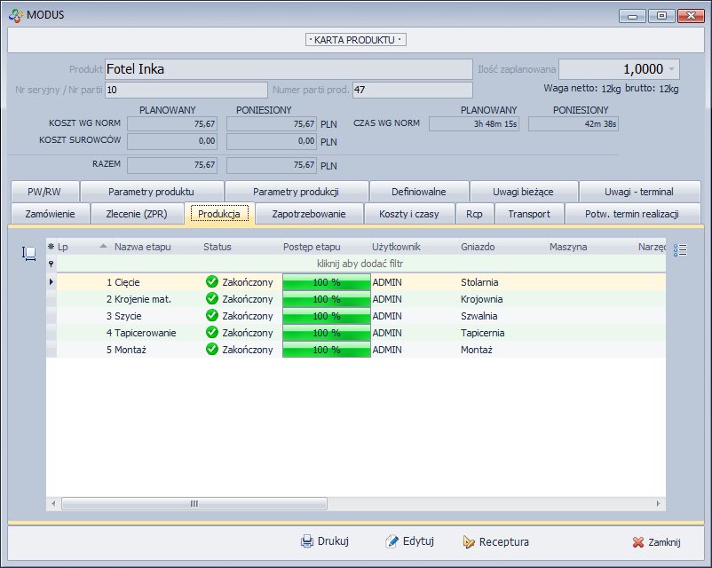 - Po kliknięciu w ikonę Karta otworzy się okno Karta produktu zawierająca informację związane z procesem produkcji: przebieg procesu, zużycie surowców.