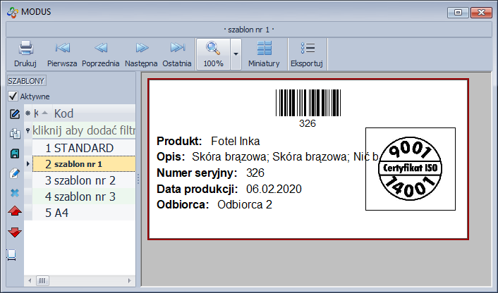 Ikona służy do wydruku etykiety produktu zawierającej numer seryjny. Wydruk jest realizowany według zdefiniowanego szablonu, który można edytować. Informacje, w jaki sposób edytować bądź stworzyć nowy szablon, znajdziesz tutaj.