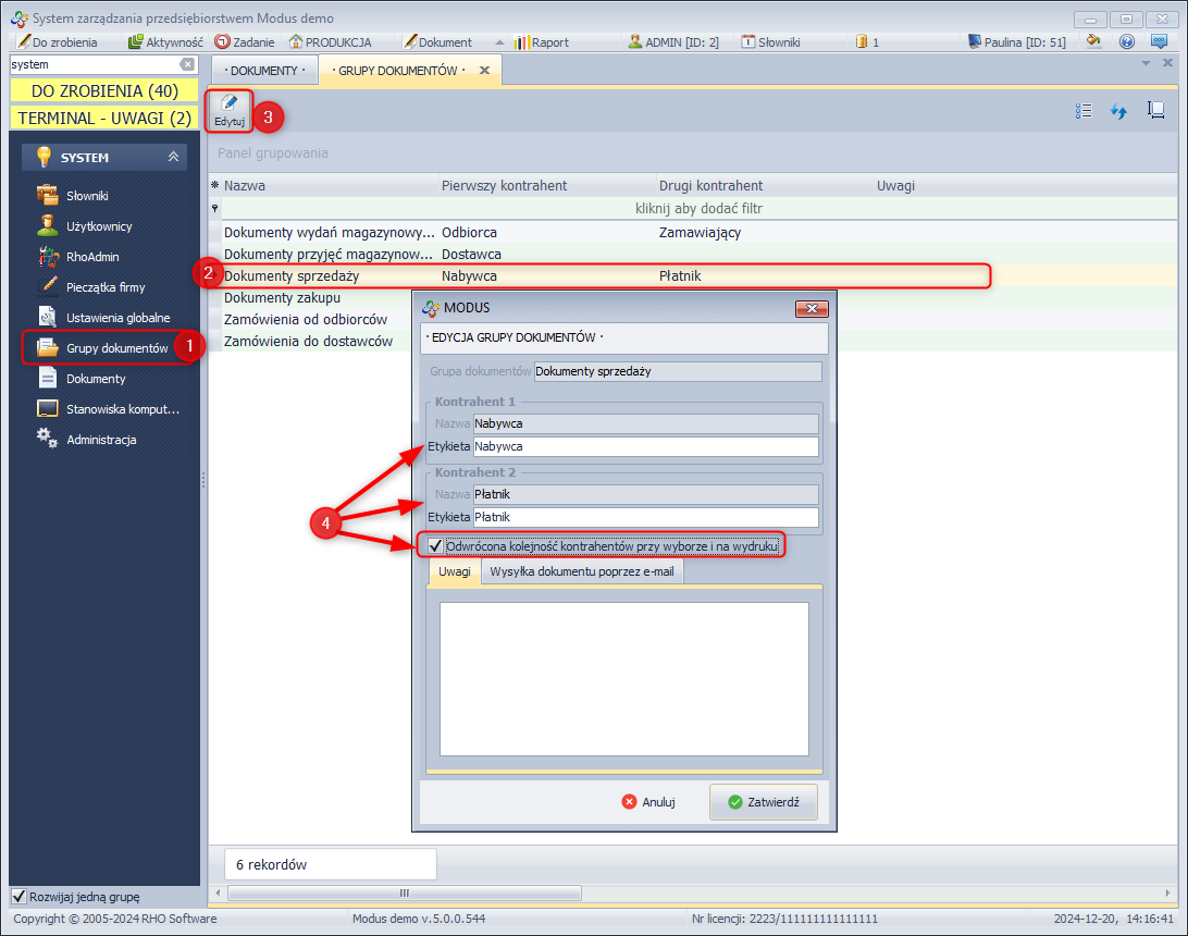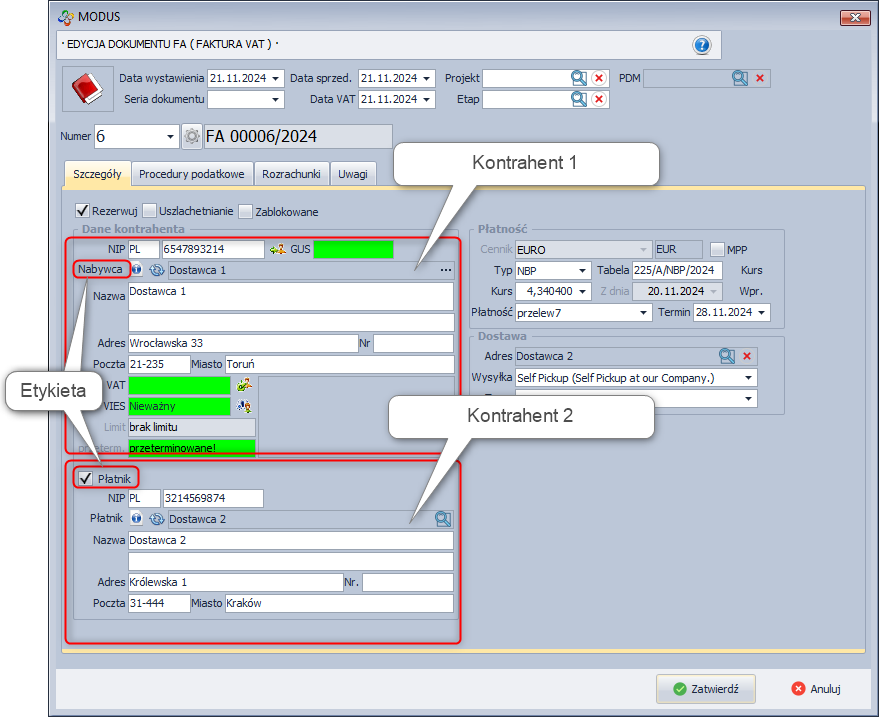 System Modus umożliwia, aby na poszczególnych dokumentach generowanych w systemie mogła znaleźć się dwóch kontrahentów oraz miejsce dostawy towaru. Kontrahenci, zależności od rodzaju dokumentu, mogą pełnić rolę: