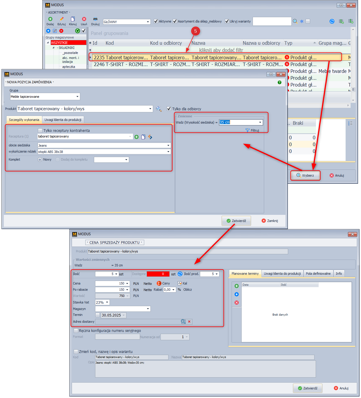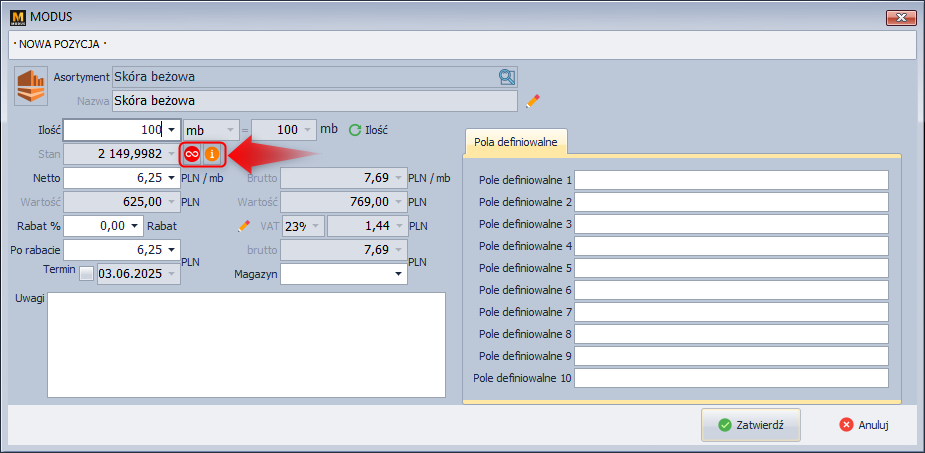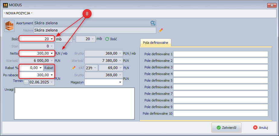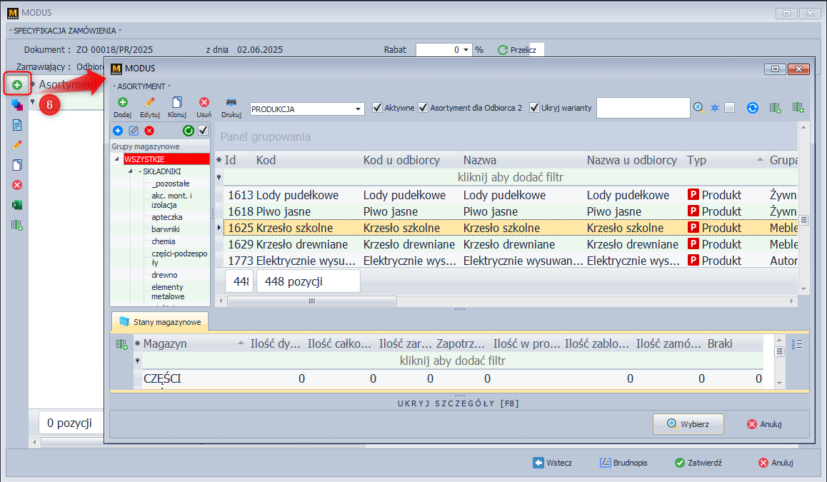Ekran 5: Dodawanie asortymentu handlowego do zamówienia (surowca).