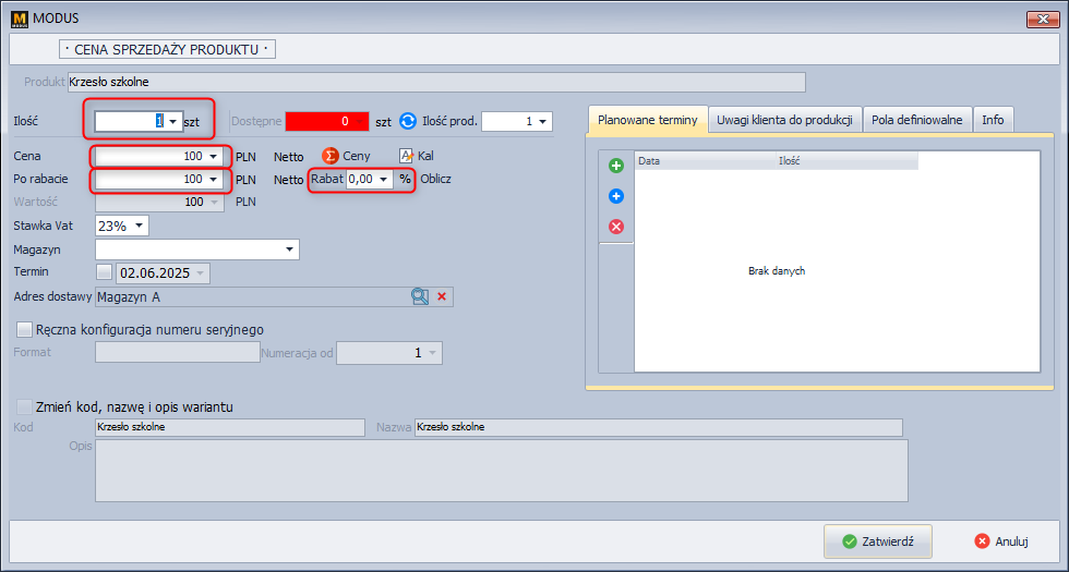 - cenę sprzedaży produktu (może zostać wybrana z grup cenowych lub wprowadzona ręcznie),