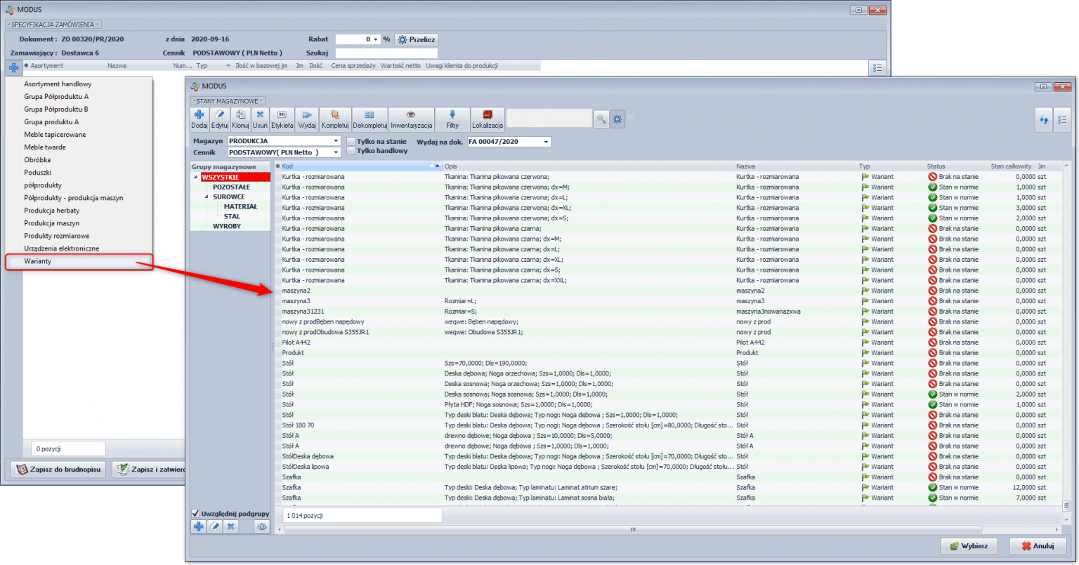 Przy tworzeniu zamówienia sprzedaży możliwe jest wyszukanie i dodanie do dokumentu konkretnego wariantu produktu, jeżeli jego kartoteka została wcześniej utworzona
