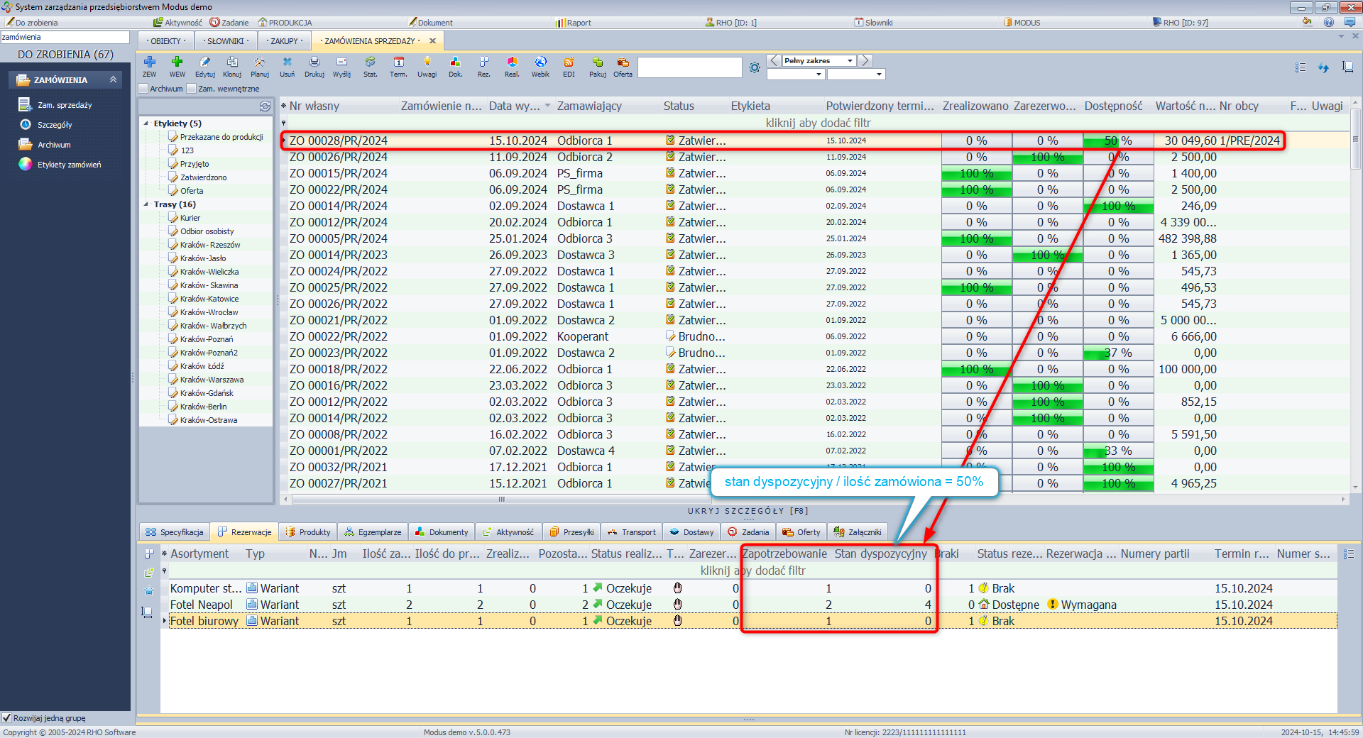 Dostępność - pasek informujący o stopniu dostępności zamówionych asortymentów na magazynie. W przypadku produktów znaczenie ma jedynie zgodność produktu zamówionego z dostępnym na magazynie, niezależnie czy produkty zostały wyprodukowane pod to konkretne zamówienie.