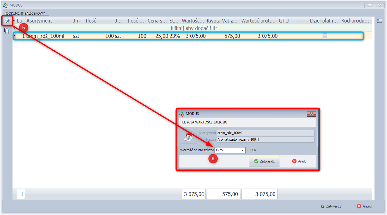 - Wprowadź wartość brutto zaliczki i kliknij Zatwierdź.