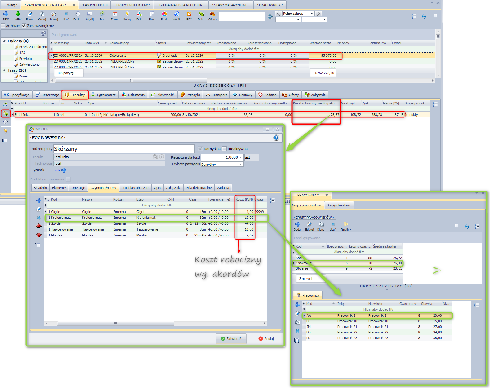 - w recepturze produktu określić normy produkcji (czasochłonność oraz stawkę akordową poszczególnych operacji),