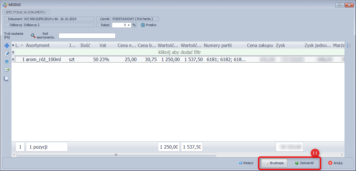 - Kliknij Zatwierdź w oknie SPECYFIKACJA DOKUMENTU lub zapisz do brudnopisu.