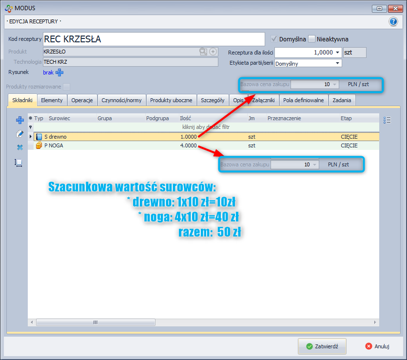 - bazowej ceny zakupu surowców wchodzących w skład receptury danego produktu.