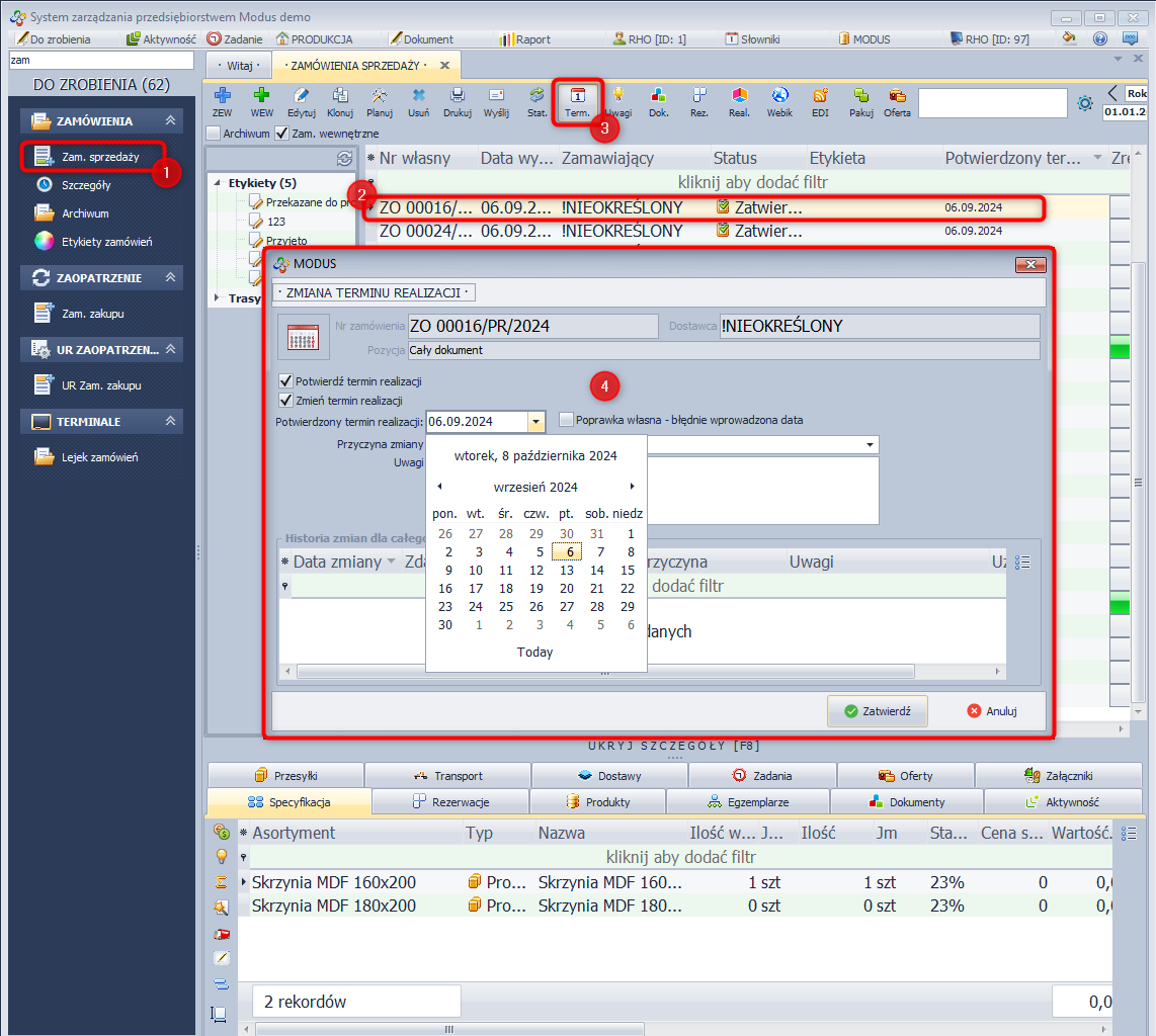 Funkcja umożliwia edycje/potwierdzenie wprowadzonego na zamówieniu wstępnego terminu realizacji całego zamówienia sprzedaży.