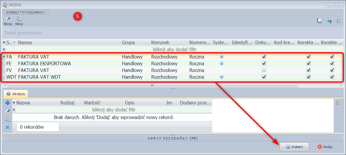 - Zaznacz typ dokumentu i kliknij Wybierz.