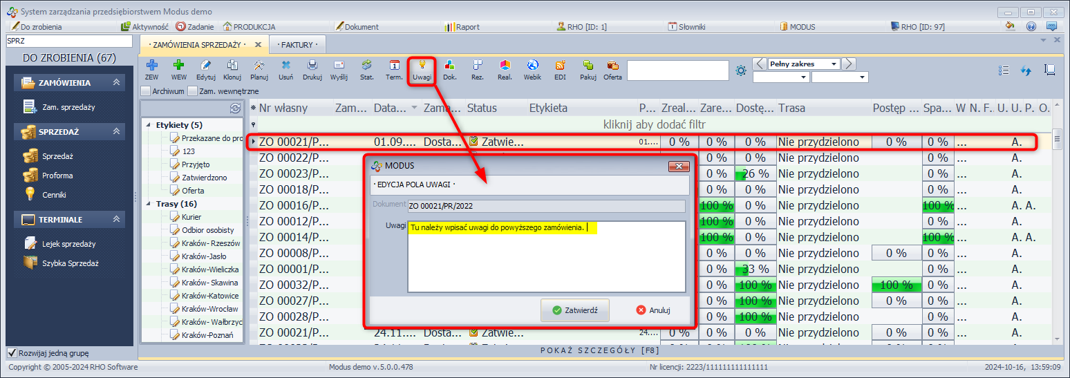 Uwagi - uwagi dotyczące zamówienia niewidoczne w innych modułach.