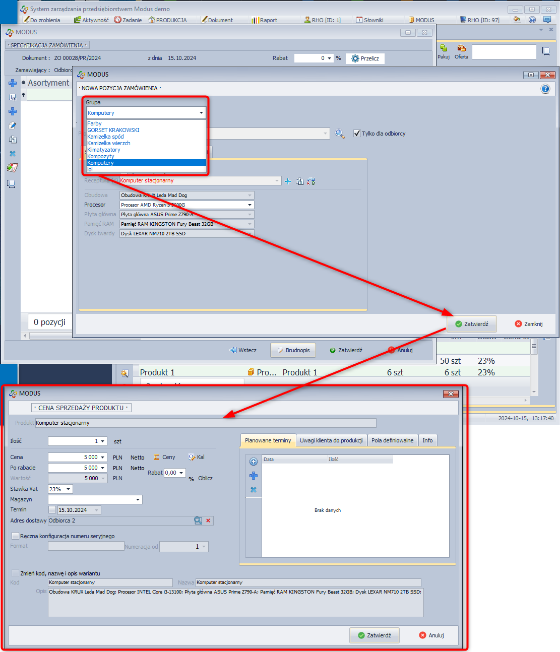 - Po dodaniu wszystkich żądanych produktów Zatwierdź okno SPECYFIKACJA ZAMÓWIENIA lub zapisz jako Brudnopis.