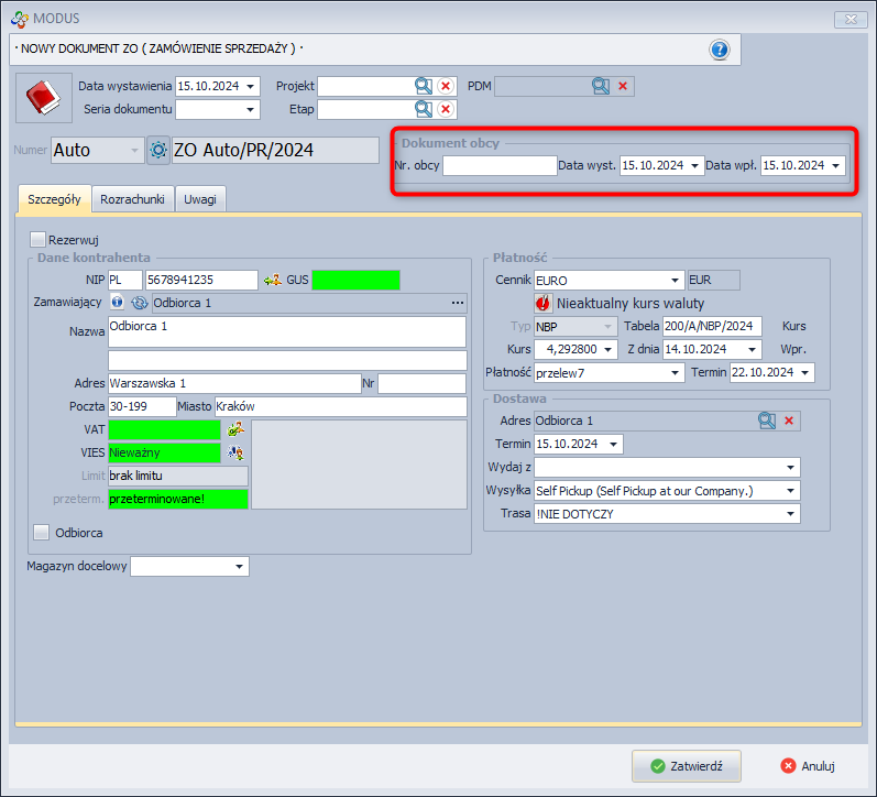 - Zamówienie zewnętrzne - to zamówienie złożone przez kontrahenta