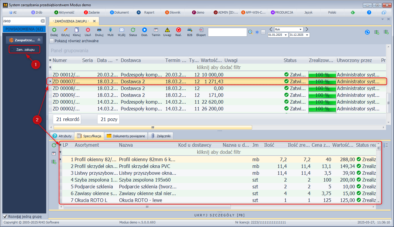 Zamówienia zakupu to moduł ZAOPATRZENIE, który pozwala na zarządzanie brakami asortymentu w przedsiębiorstwie. Jest on powiązany z narzędziem określającym zapotrzebowanie. Na podstawie zapotrzebowania użytkownik ma możliwość generowania zamówień. Ze względu na istnienie możliwości częściowej realizacji zamówienia w programie wprowadzono funkcję dostawa. Pozwala ona na przyjęcie tylko części zamówionego towaru, która zostanie uwidoczniona w magazynie w zakładce partie.