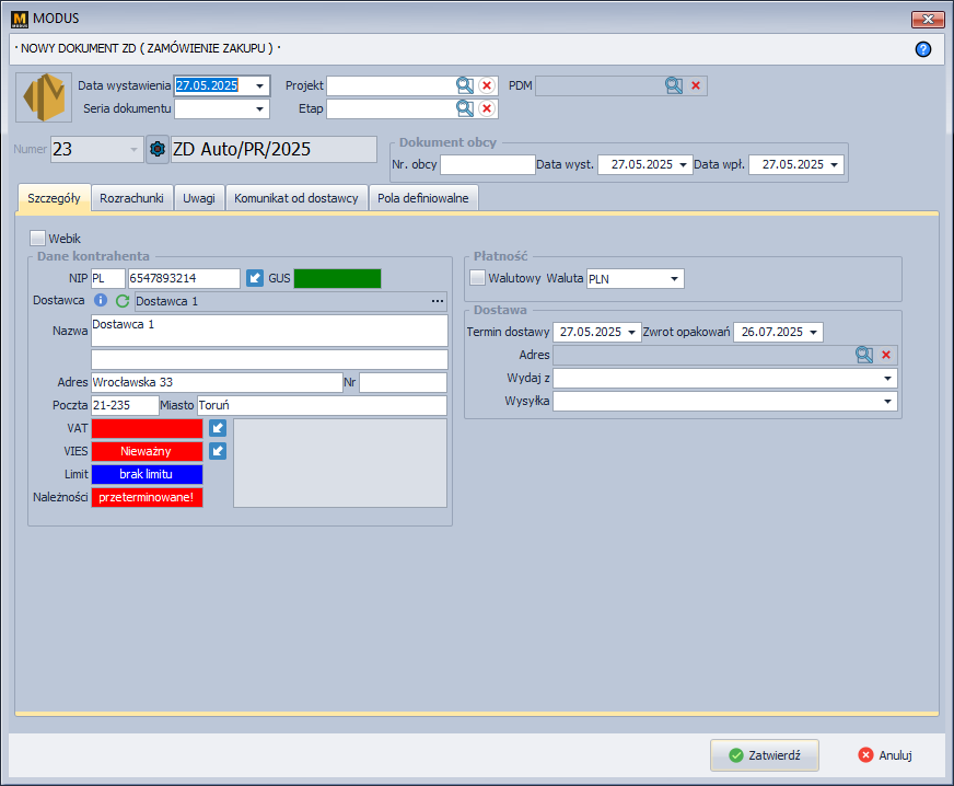 - wyświetlenie danych adresowych dostawcy które będą widoczne na dokumencie ZD