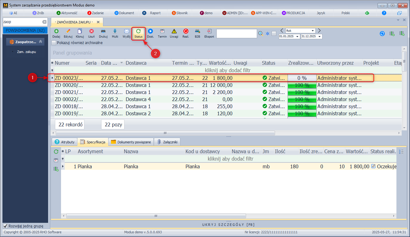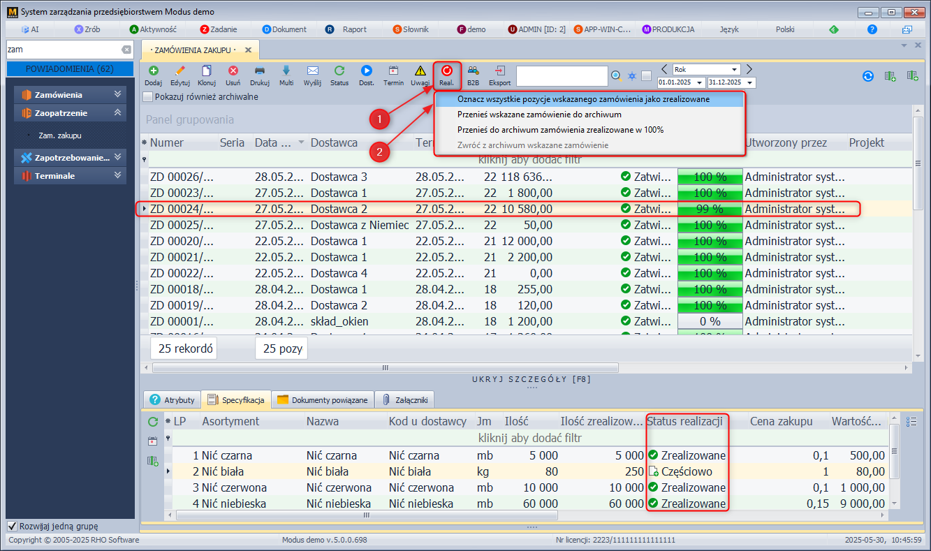 Ikona „Realizacja” służy do oznaczania zamówień jako zrealizowane. Dotyczy zamówień zrealizowanych częściowo, a których pozostała część nie zostanie dostarczona. Oznaczenie tego typu zamówień jest istotne z punktu widzenia zapotrzebowania materiałowego, ponieważ zamówienia do dostawców są uwzględniane przy wyliczaniu tegoż zapotrzebowania. System traktuje taki asortyment jako w trakcie oczekiwania na dostawę co nie jest zgodne z rzeczywistością. W celu wyznaczania prawidłowego zapotrzebowania - zamówienia, które nie zostały zrealizowane w całości, a których realizacja nie zostanie dokończona należy oznaczyć jako zrealizowane.
